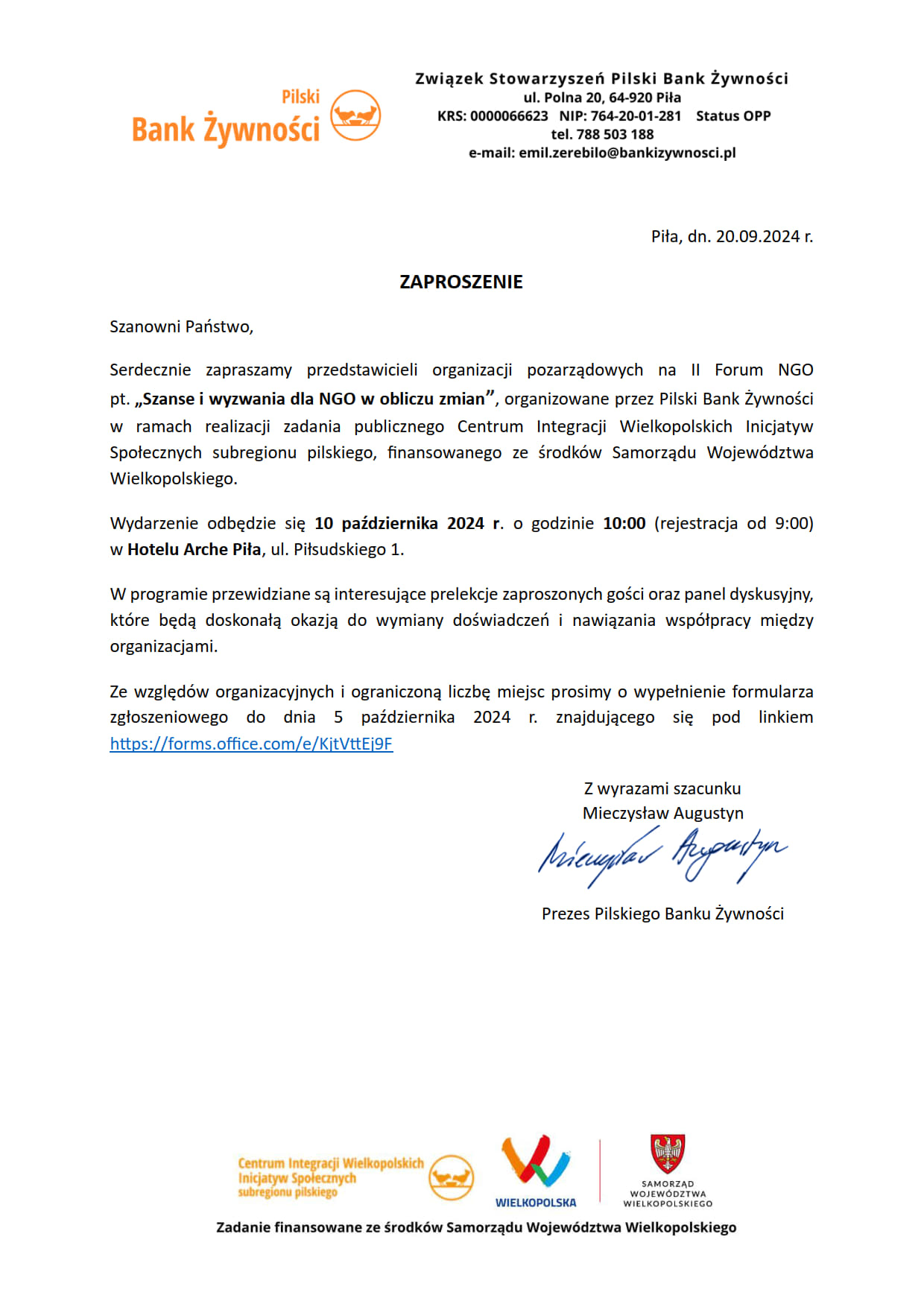 Związek Stowarzyszeń Pilski Bank Żywności serdecznie zaprasza przedstawicieli organizacji pozarządowych na II Forum NGO pn. "Szanse i wyzwania dla NGO w obliczu zmian"