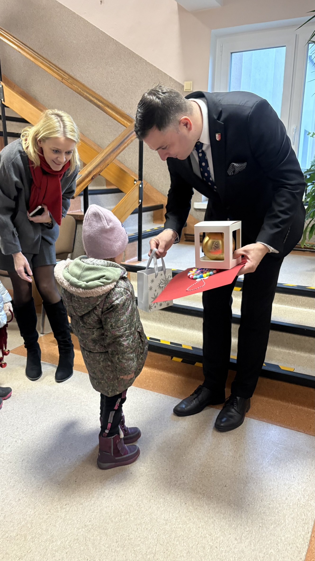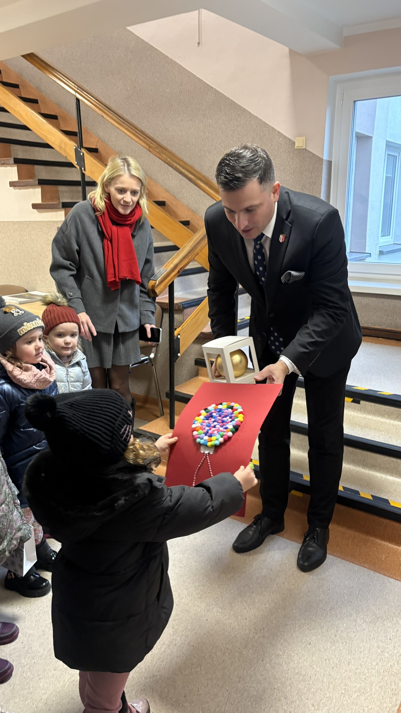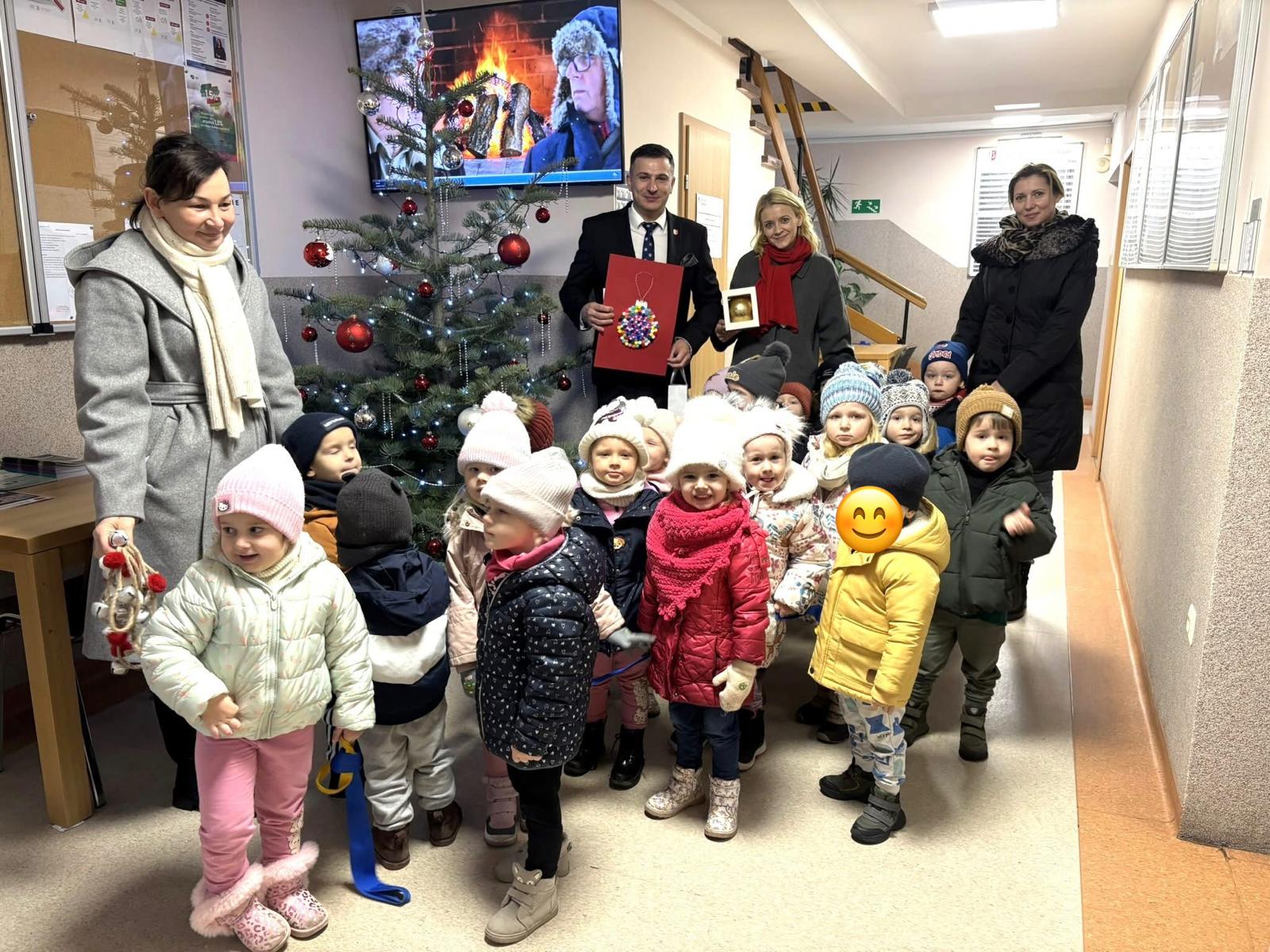Wójt serdecznie podziękował maluchom za tak miłe odwiedziny i wyraził swoją wdzięczność za tę niespodziankę, po czym podarował dzieciom świąteczną bombkę, życząc jednocześnie wesołych, spokojnych i rodzinnych świąt wszystkim dzieciom z przedszkola, pracownikom placówki oraz ich najbliższym.