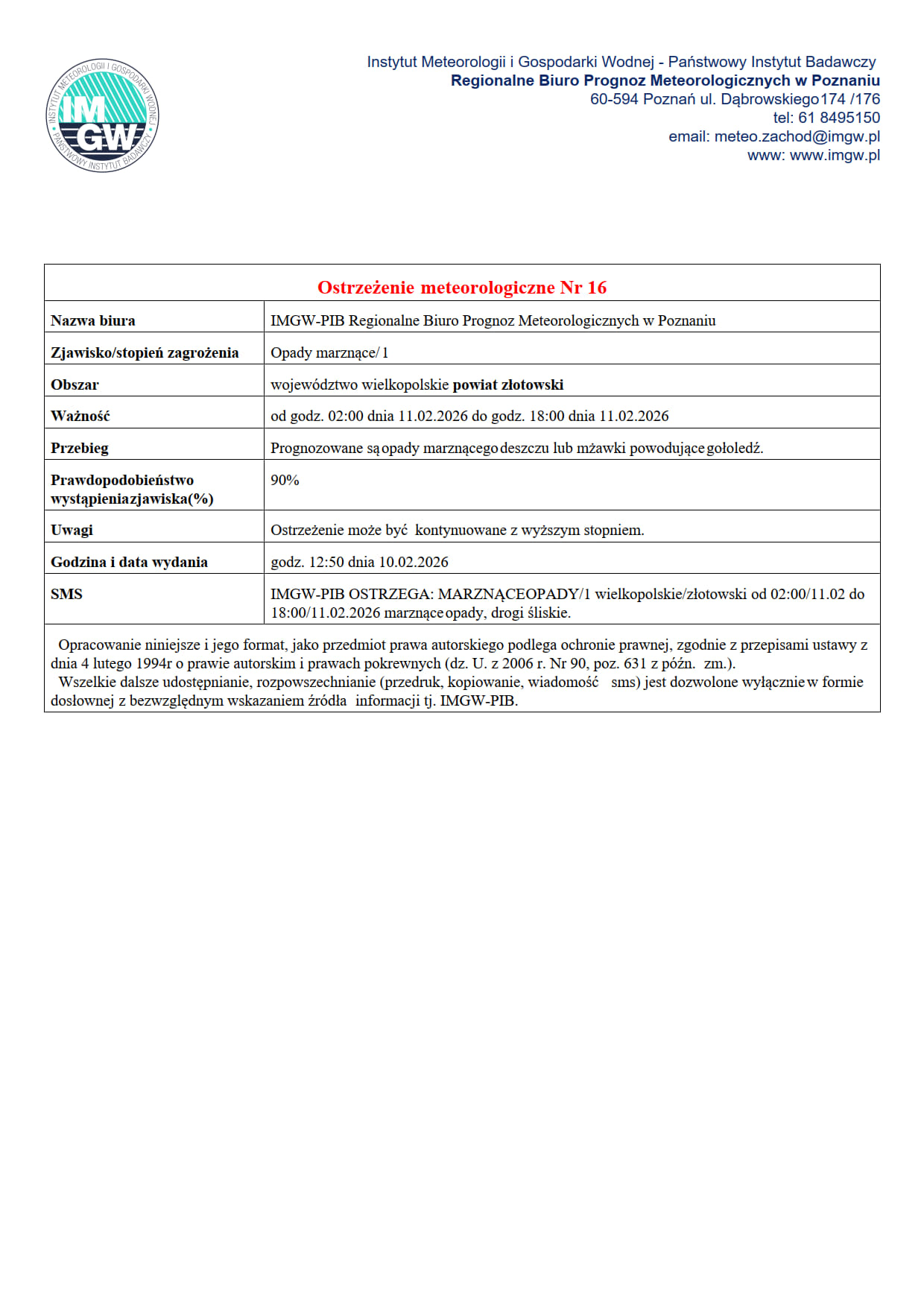 6 lut 2026 Ostrzeżenie meteorologiczne nr 15- marznące opady/1