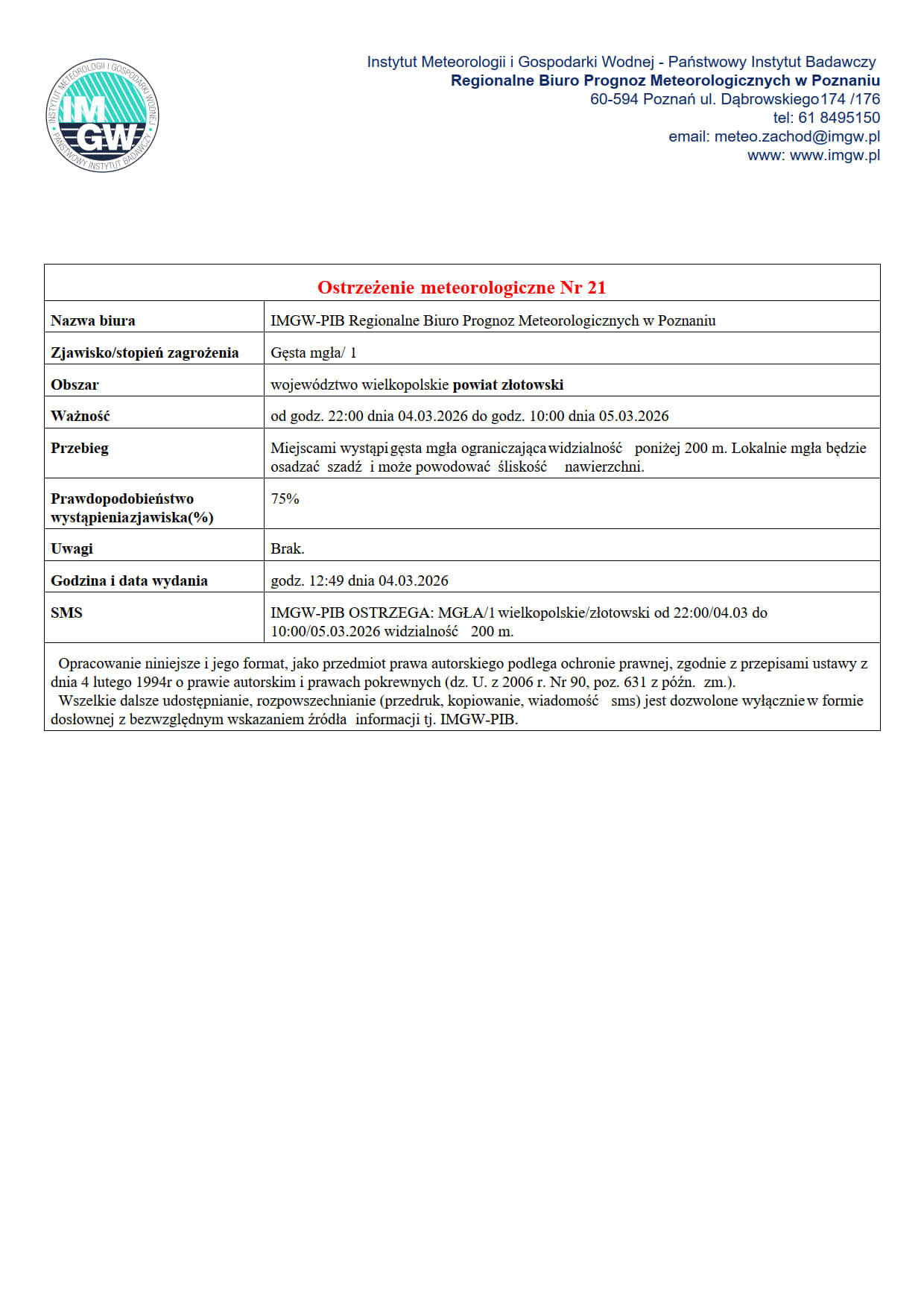 Ostrzeżenie meteorologiczne Nr 21 - gęsta mgła/1