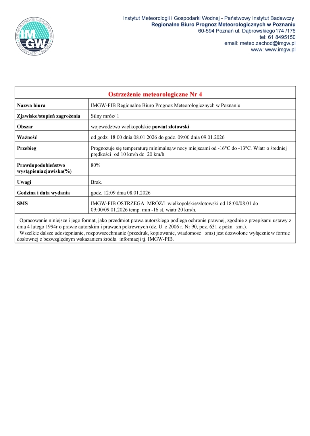 Ostrzeżenie meteorologiczne nr 4 - Silny mróz/1