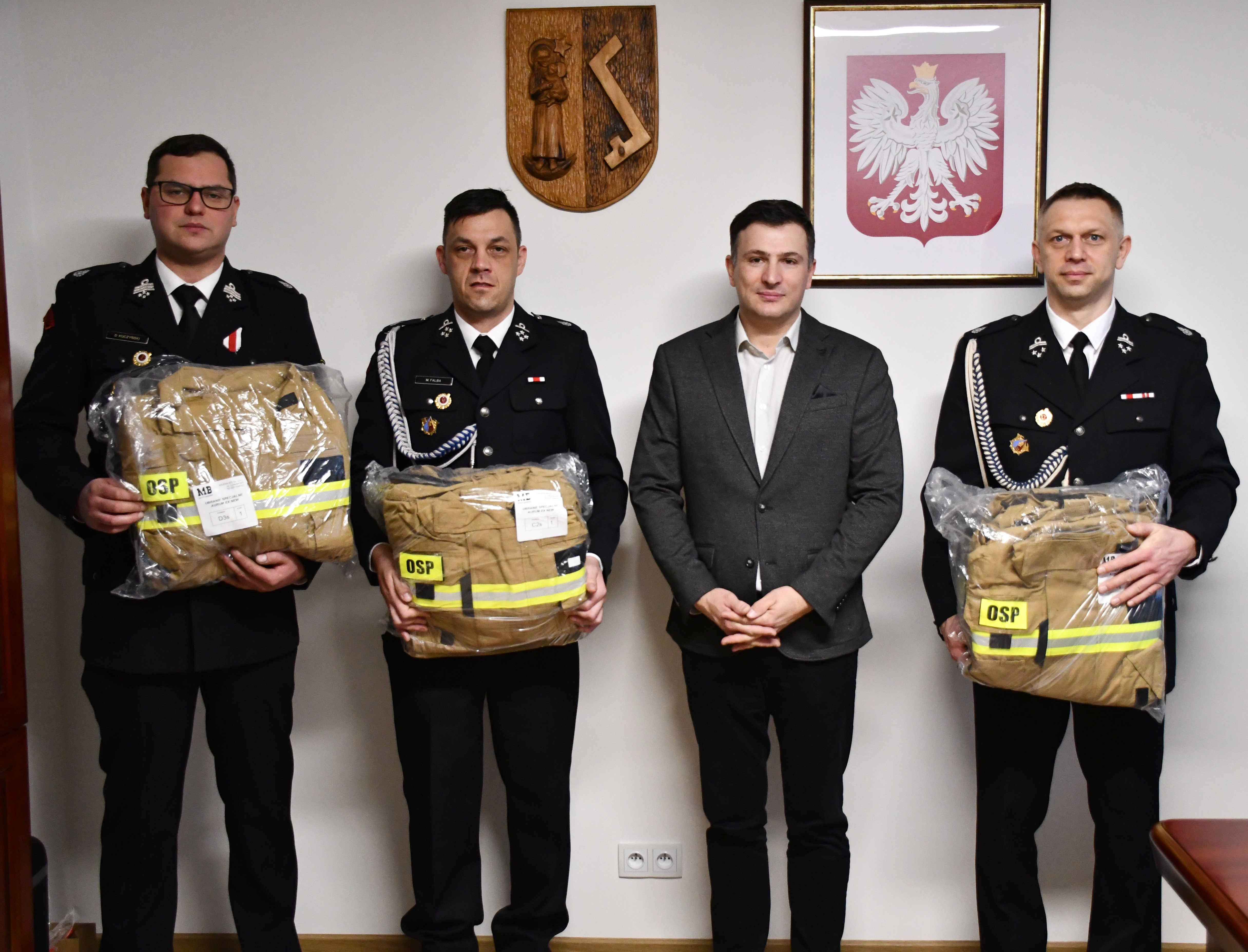 Dziś odbyło się przekazanie sprzętu. W spotkaniu uczestniczyli m.in. Wójt Gminy Marek Buława, Komendant Gminny OSP dh Mateusz Wiebskowski, Zastępca Komendanta Gminnego OSP dh Dominik Kuczyński oraz przedstawiciele wszystkich jednostek, które otrzymały wyposażenie.