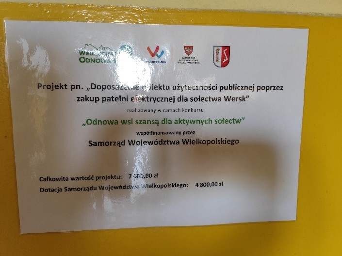 Projekt pn. „Doposażenie obiektu użyteczności publicznej poprzez zakup patelni elektrycznej dla sołectwa Wersk uzyskał dofinansowanie Urzędu Marszałkowskiego Województwa Wielkopolskiego w ramach XIII edycji konkursu „Odnowa wsi szansą dla aktywnych sołectw”.