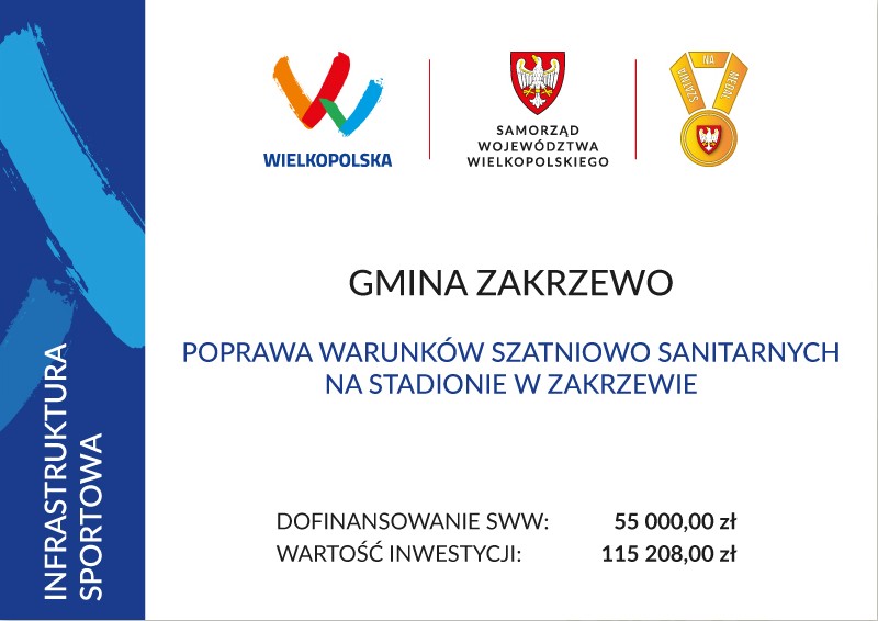 Pozyskane środki umożliwiły realizację zadania pn. „Poprawa warunków szatniowo-sanitarnych na stadionie w Zakrzewie”, którego efektem jest kompleksowo zmodernizowana szatnia sportowa. Z końcem listopada zakończyły się prace remontowe, których nadrzędnym celem była poprawa komfortu użytkowania obiektu zarówno przez zawodników, jak i osoby korzystające z infrastruktury sportowej.